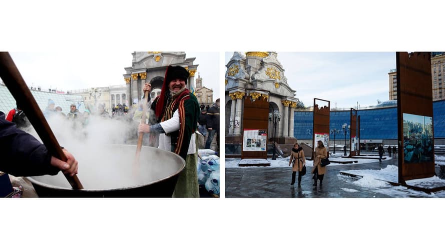 ЛІВОРУЧ: Чоловік у козацькому одязі готує закарпатський банош на польовій кухні на Майдані Незалежності, який на той час уже перетворився на повноцінне окреме містечко зі своїми мешканцями та інфраструктурою, Київ, 7 грудня 2013 року. ПРАВОРУЧ: Жінки проходять повз конструкції зі світлинами часів Революції Гідності біля стели на Майдані Незалежності, Київ, 18 листопада 2018 рокуEPA/ZURAB KURTSIKIDZE; Анастасія Власова/Громадське