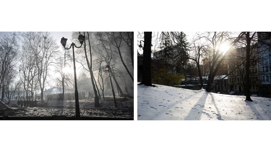 ЛІВОРУЧ: Силовики між деревами в парку на вулиці Грушевського в перерві між активними протистояннями з протестувальниками, Київ, 25 січня 2014 року. У них під ногами — шматки бруківки, яка «прилетіла» з боку майданівців. ПРАВОРУЧ: Порожній пагорб у парку на Грушевського зі слідами на снігу, Київ, 18 листопада 2018 рокуEPA/ALEXEY FURMAN; Анастасія Власова/Громадське