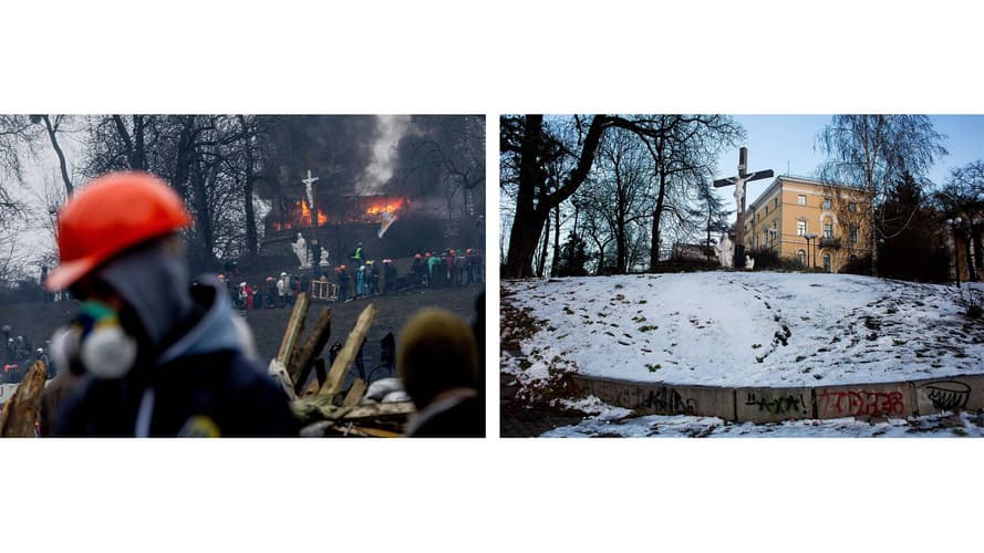 ЛІВОРУЧ: Протестувальники на пагорбі біля Жовтневого, 20 лютого 2014 року. На задньому плані палають автобуси, які залишили силовики. ПРАВОРУЧ: Пам'ятний хрест жертвам Голодомору та політичних репресій на пагорбі над Майданом Незалежності біля Жовтневого палацу в Києві, 18 листопада 2018 рокуЄвген Малолєтка/УНІАН; Анастасія Власова/Громадське