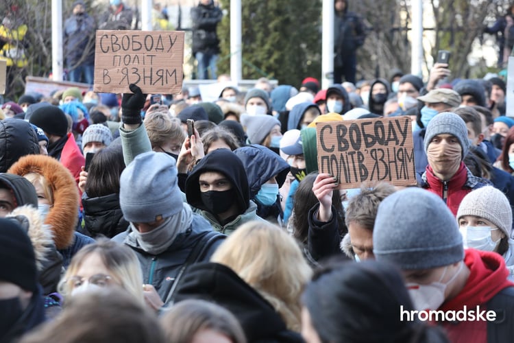 Протестувальники під стінами Офісу генпрокурора вимагають звільнення активіста Сергія Стерненка та відставки генпрокурорки Ірини Венедіктової, Київ, 27 лютого 2021 року.Олександр Хоменко/hromadske