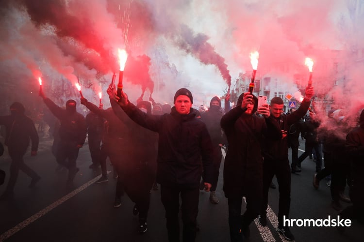 Згодом учасники акції рушили до Офісу генпрокурора. Дорогою і біля будівлі ОГП вони палили димові фаєри. Частину із них демонстранти кидали в бік будівлі.