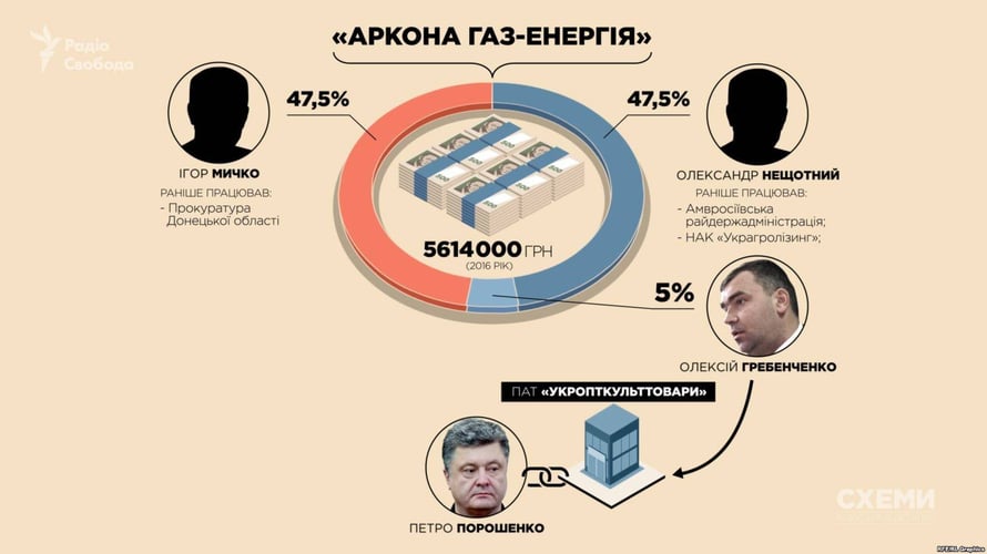Журналісти з'ясували, що з приватною компанією «Аркона Газ-Енергія» пов'язані люди з оточення Порошенка — член Вищої ради правосуддя Олексій Маловацький та колишні менеджери з бізнес-структур Порошенка, зокрема екс-директор його спортклубу «5 елемент».