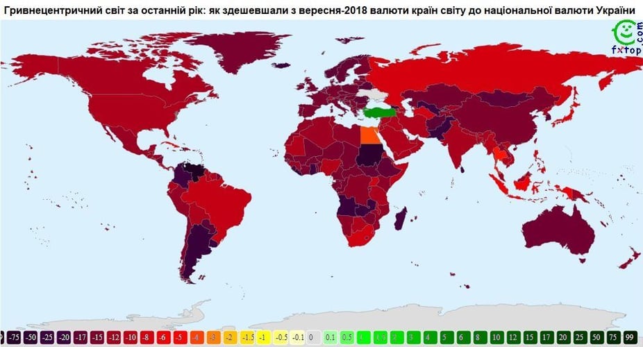 За даними НБУ, найбільше відносно гривні послабилася валюта Венесуели — на 99,9%, однак точних даних щодо девальвації цієї валюти у Нацбанку назвати не можуть. Також за останній рік відносно гривні послабився курс російського рубля (на 8%) та долару США (на 11,3%).