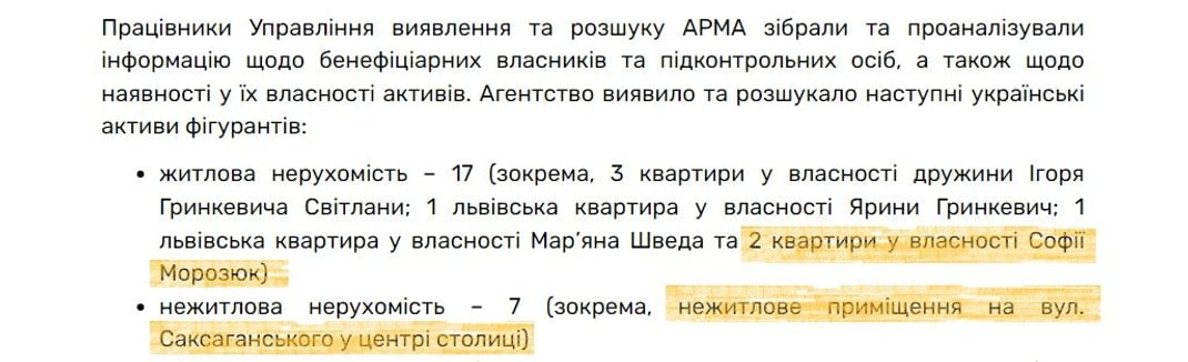 Утім, розслідування hromadske виявило, що жоден з трьох об'єктів нерухомості Соні Морозюк станом на 31 січня 2024 року не арештували.