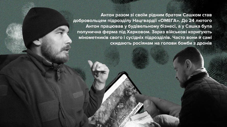 Антон і Сашко — «гострі картузи». Вони — два рідних брати з Харкова. Антон працював у будівельному бізнесі, Сашко займався фермерством. Але 24 лютого 2022 обидва стали добровольцями підрозділу Нацгвардії «Омега». Спочатку захищали власне місто, потім Харківську область, тепер уже четвертий місяць у Бахмуті. Були і штурмовиками, і АГСниками, на війні навчилися бути й пілотами — аеророзвідниками.