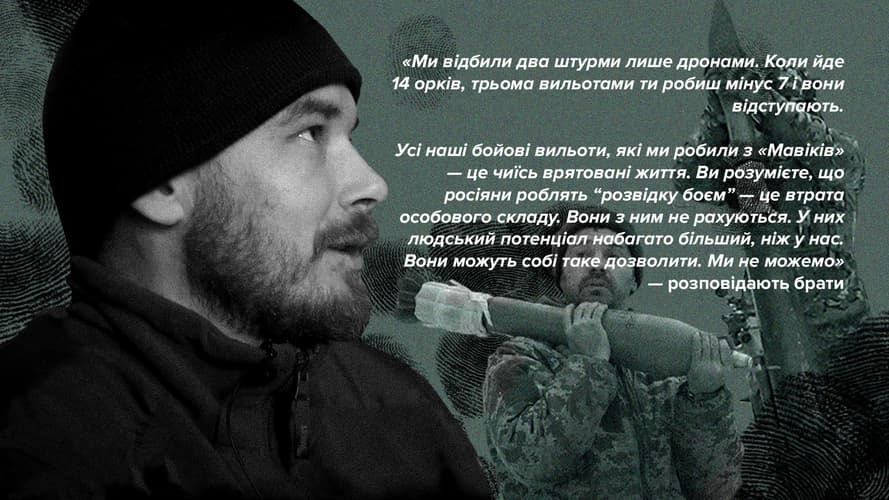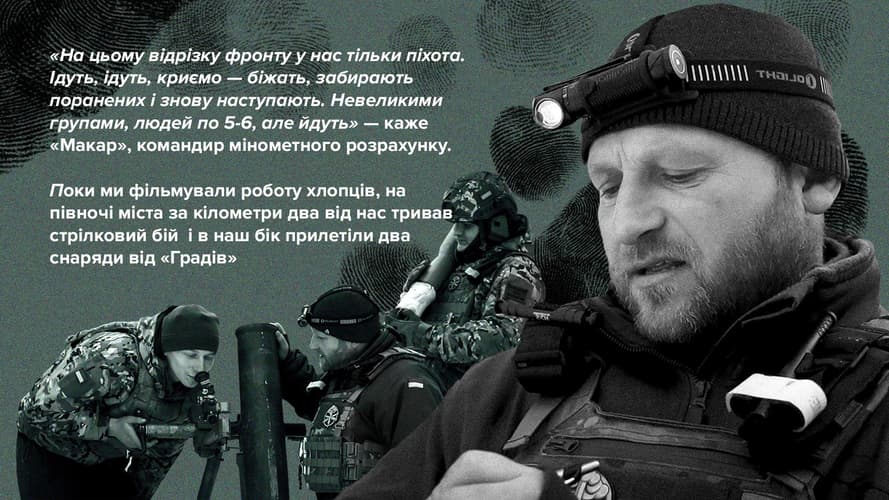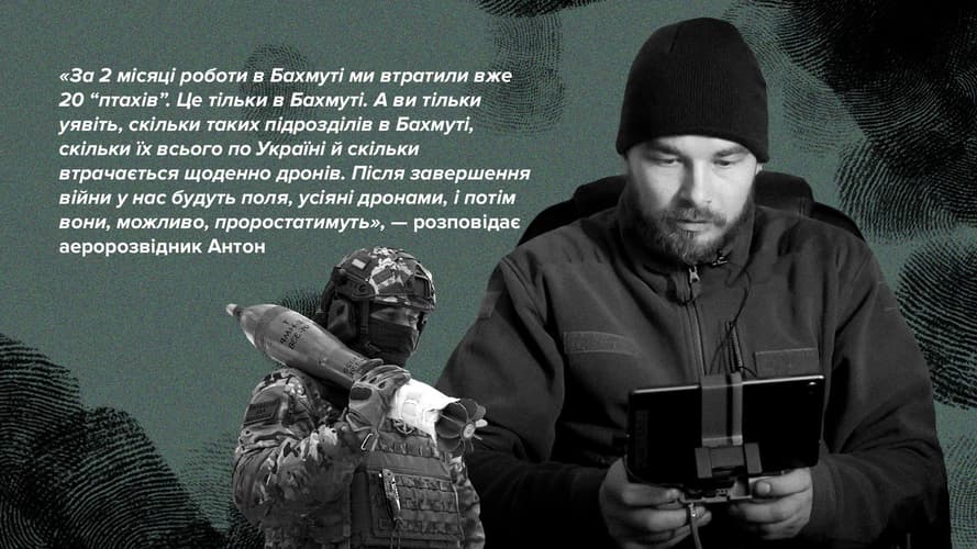 У Бахмуті з ними літають одночасно сотні дронів. Лінія фронту тут величезна, хоча бої йдуть і в місті, й на околицях. Коригують мінометників свого ж і сусідніх підрозділів і часто самі скидають росіянам на голови бомби з дронів.