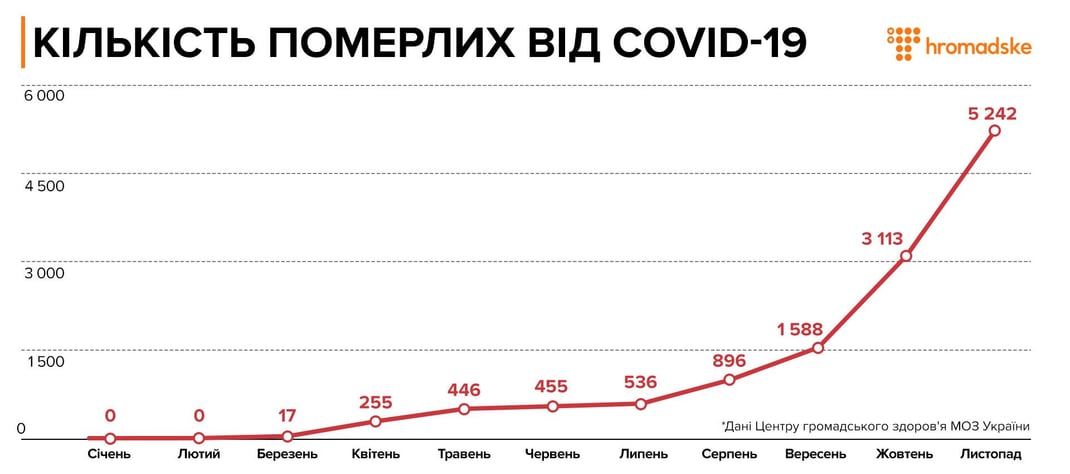 Відносна стабільність 446-536 померлих на місяць трималась у травні-липні, після першого локдауну. А з серпня кількість померлих зростає у геометричній прогресії — щомісяця збільшується в 1,5-2 рази.