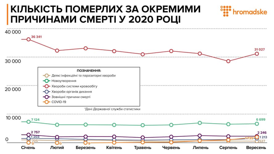 Коронавірусна хвороба COVID-19 в ці 2% не входить, її служба статистики виносить в окрему категорію. У період січень-вересень, за даними Держстату, від COVID-19 померли 4300 українців і це не перевищує 1% смертей за цей період.