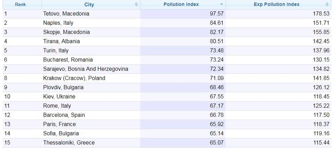 Найзабрудненішим містом Європи стало македонське Тетово. Другу сходинку посів італійський Неаполь, за ним — столиця Македонії Скоп’є.