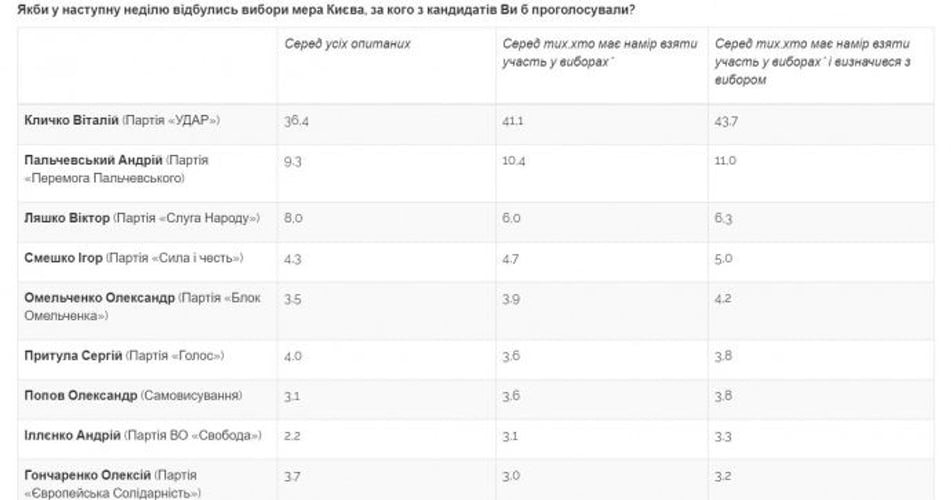 Якби вибори міського голови столиці проходили найближчим часом, найбільшу підтримку на них отримав би чинний мер Віталій Кличко — за нього готові проголосувати 43,7% тих, хто готовий взяти участь у виборах і визначився, за кого з кандидатів голосуватиме. На другому місці за кількістю потенційних голосів — бізнесмен, колишній перший заступник Міністра України у справах сім'ї, молоді та спорту Андрій Пальчевський. Його готові підтримати 11% таких респондентів. На третьому місці заступник міністра охорони здоров'я й головний санлікар Віктор Ляшко — за нього готові віддати голоси 6,3% респондентів, які визначилися зі своїм кандидатом.