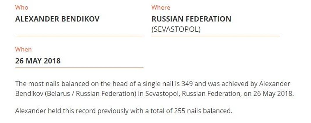 Він утримав на одному цвяху ще 349 цвяхів. Це досягнення було оформлено і підписано місцевими майстрами спорту з гандболу та волейболу.