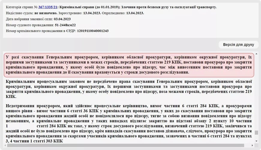 Згідно із суддівським висновком, якщо прокурори закрили справу, а потім керівник її відновив, наприклад, через незаконність закриття, то час, поки справою ніхто не займався, враховується у строки досудового розслідування. Така практика може призвести до закриття багатьох справ через кінець строків давності.