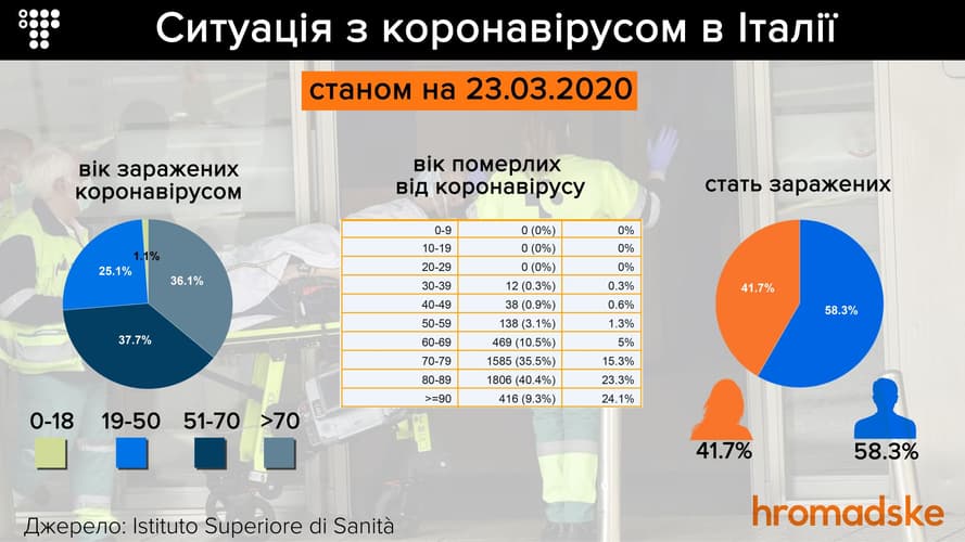 На початку березня ВООЗ назвала середній відсоток людей, що померли від коронавірусу в світі — 3,4%. Але в Італії, де наразі найбільше померлих, цей показник майже втричі вищий — 9,2%. Тобто помирає практично кожен десятий, у кого виявили коронавірус.