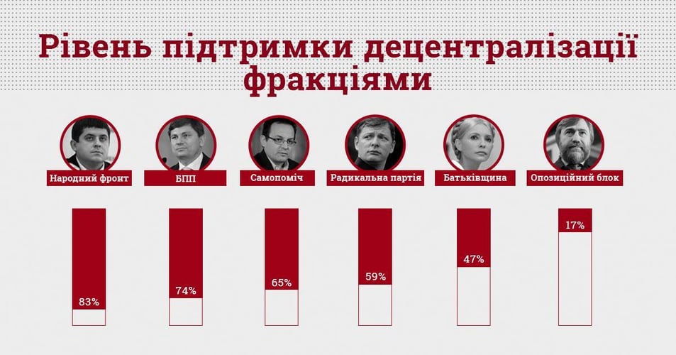 Найбільше реформу децентралізації в Україні підтримує парламентська фракція «Народний фронт», найменше — «Опозиційний блок». Про це повідомила громадська організація «Комітет виборців України», спираючись на кількість депутатів певної фракції, які голосували за закони щодо децентралізації.