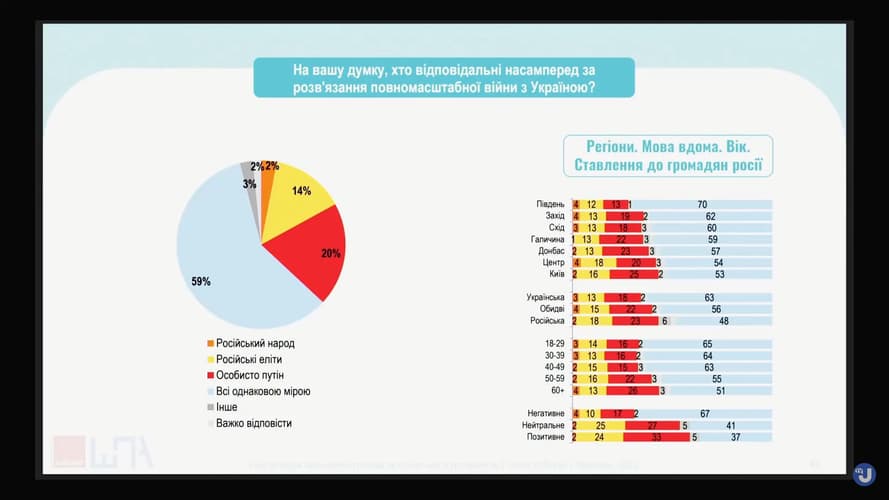 Так, 2% опитаних зазначили, що російський народ насамперед відповідальний за розв'язання війни, а 14% назвали винними передовсім російські еліти. Ще 20% респондентів зазначили, що відповідальність несе особисто путін, а 59% вважають, що відповідальні всі однаковою мірою.