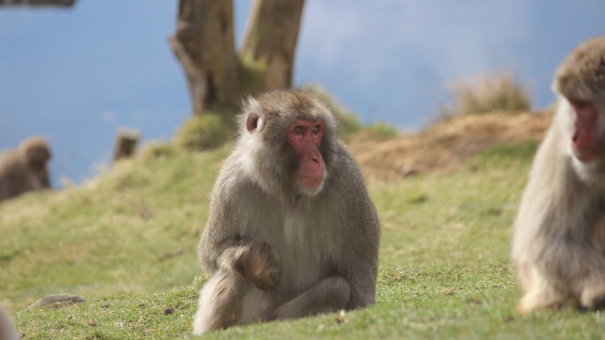 Японська макака, також відома як снігова мавпа, розміром приблизно із собаку середнього розміру.