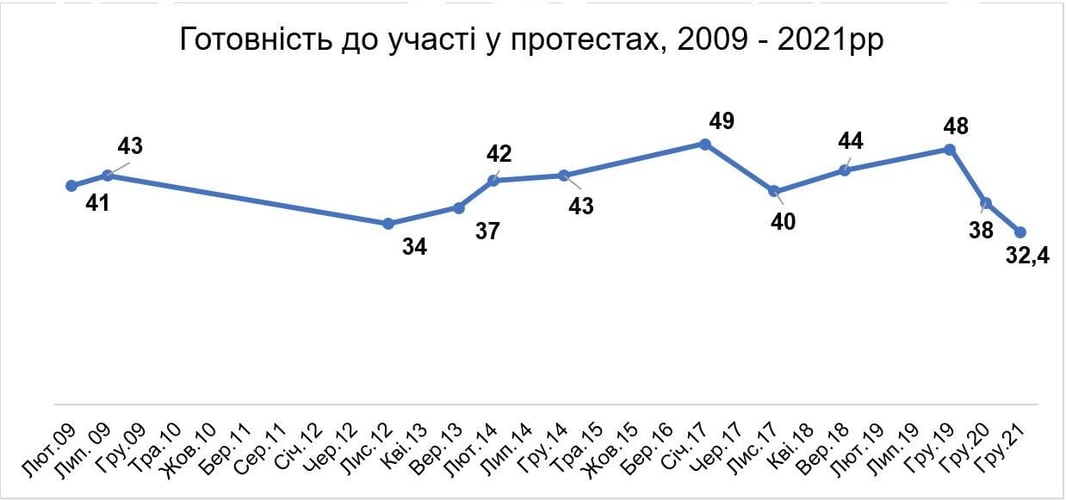 Взяти участь у протесті готові 32,4% українців. У порівнянні з 2020 роком цей показник зменшився на 5,6% — загалом це найменший рівень готовності до протесту за останні 12 років.