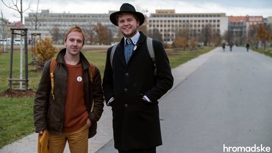 За три дні до демонстрації ми зустрілись із Мікулашом Мінаром та його колегою Беньяміном Роллєм на рівнині Летна, де відбувалися і наймасовіші мітинги часів Оксамитової революції. Вони обидва вивчають протестантську теологію, а Беньямін одного дня планує стати пастором. Однак зараз він активно займається громадським активізмом. Вони не застали часів комунізму, але кажуть, що події 30-річної давнини їх надихають.