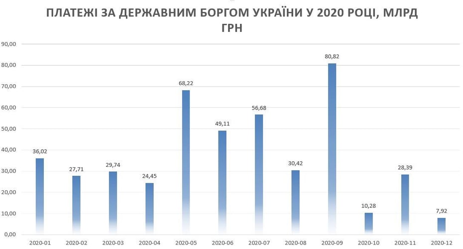 За даними Мінфіну, протягом січня-березня 2020 року уряд виплатив 93,47 мільярда гривень на погашення та обслуговування державного боргу. Загалом, включно з цими трьома місяцями, у 2020 році уряд має витратити на виплату за державними боргами 449,75 мільярда гривень (тобто, залишилося виплатити ще 356,28 мільярда гривень).