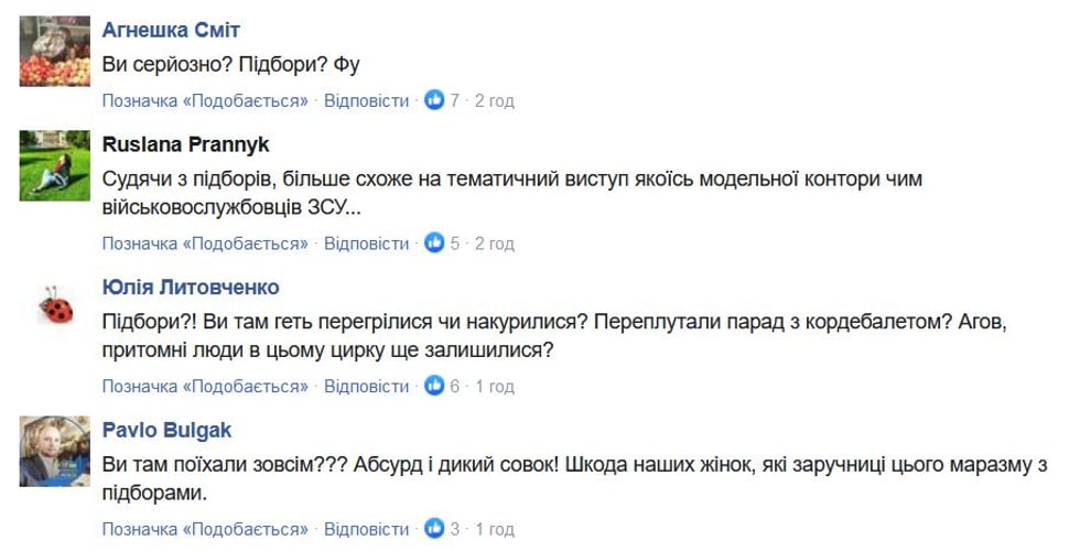 У коментарях під дописом Міноборони про підготовку військовослужбовиць до параду рішення, щоб вони марширували на підборах, розкритикували. Міністерство згодом вимкнуло коментарі під дописом у Facebook, але на сайті АрміяInform їх досі можна залишати.