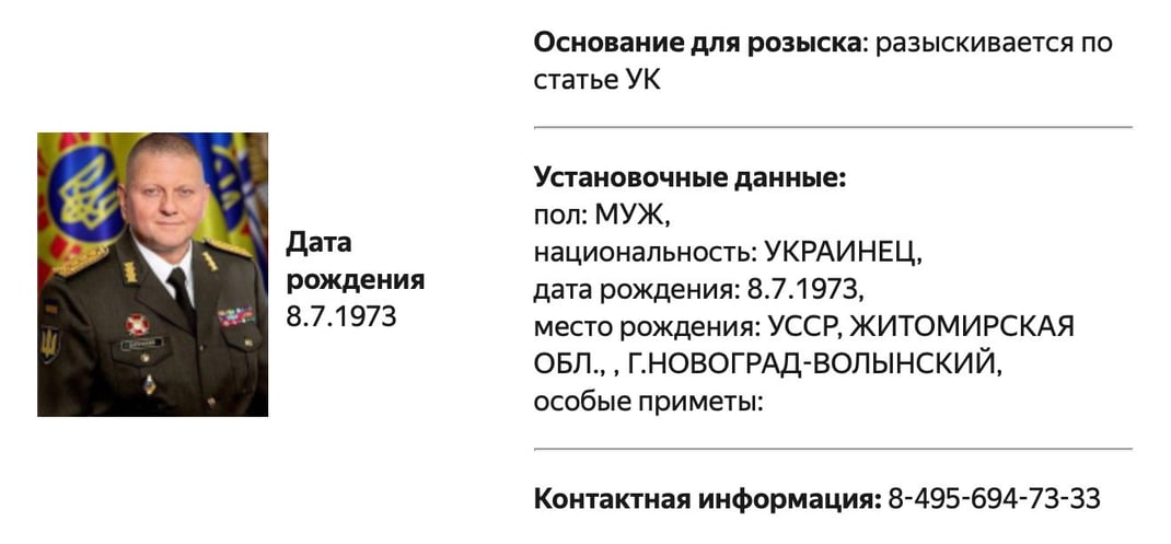 Міністерство внутрішніх справ росії оголосило у розшук головнокомандувача Збройних сил України Валерія Залужного.
