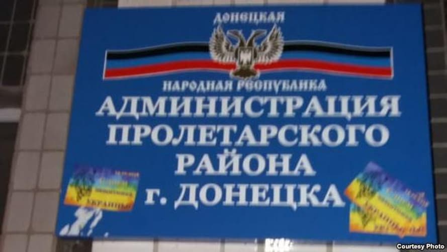Зокрема, у Донецьку синьо-жовті листівки помітили на будівлі окупаційної «адміністрації» Пролетарського району міста.