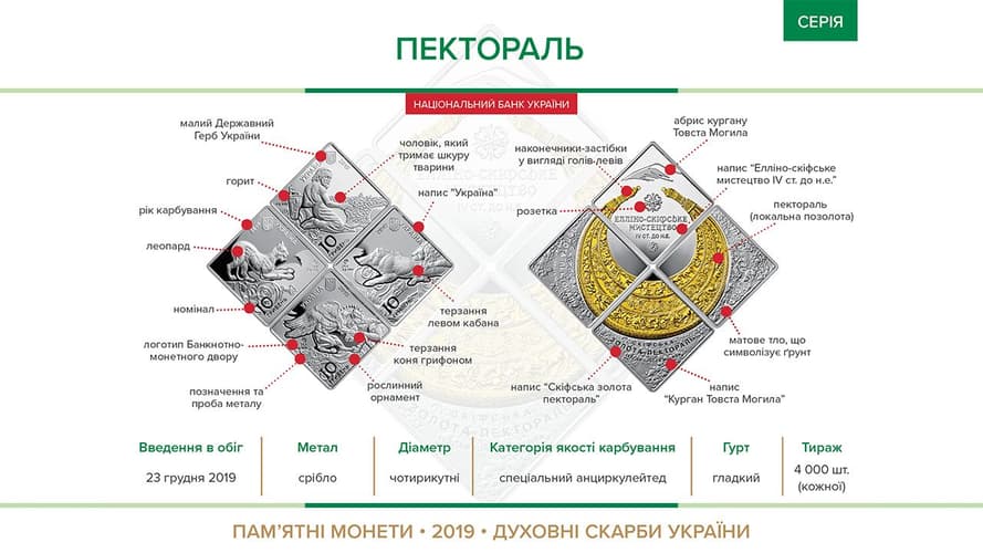 Так, «Найкращою монетою року» став набір із чотирьох пам’ятних монет «Пектораль» із зображенням на реверсі старовинної скіфської пекторалі. Вони зроблені зі срібла, номінал кожної монети — 10 гривень.