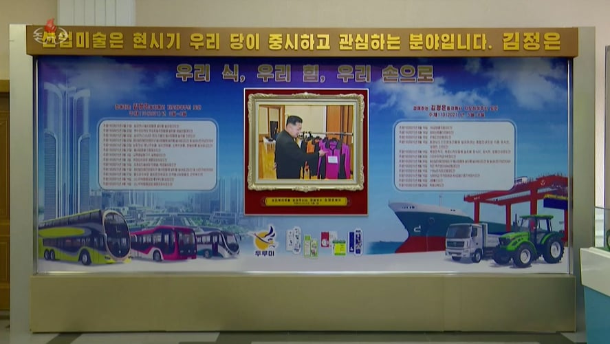 Біля входу до експозиції розміщене інформаційне табло, на якому написано, що Кім Чен Ин 25 днів у лютому-травні 2021 року був зайнятий «скеровуванням» дизайну 110 об’єктів. Вказані дати розташовані між тими днями, коли державні ЗМІ повідомляли про публічну появу Кім Чен Ина.