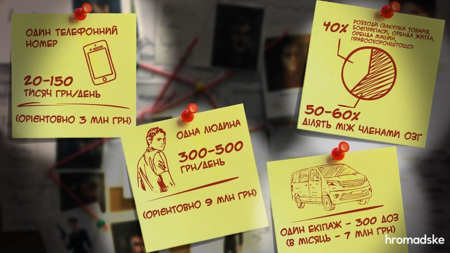 За словами місцевого блогера та бізнесмена Олексія Таймурзіна, обізнаного щодо діяльності наркоторговців, один телефонний номер, за яким продають наркотики, може приносити від 20 до 150 тисяч гривень на день. «А в них (у кожної з груп, що працюють у місті — ред.) 20-25 таких номерів, тобто в середньому 3 мільйони в день. З цієї суми заберіть щонайбільше 40% на розходи — це закупка товарів, якісь боєприпаси, оренда квартир, машин, платня ментам. Залишається 50-60%, які вони ділять між всіма членами ОЗГ», — каже Таймурзін.