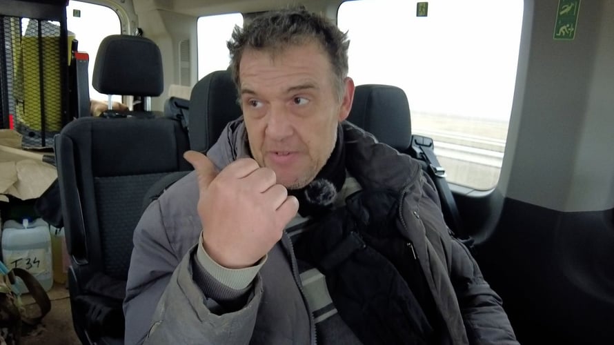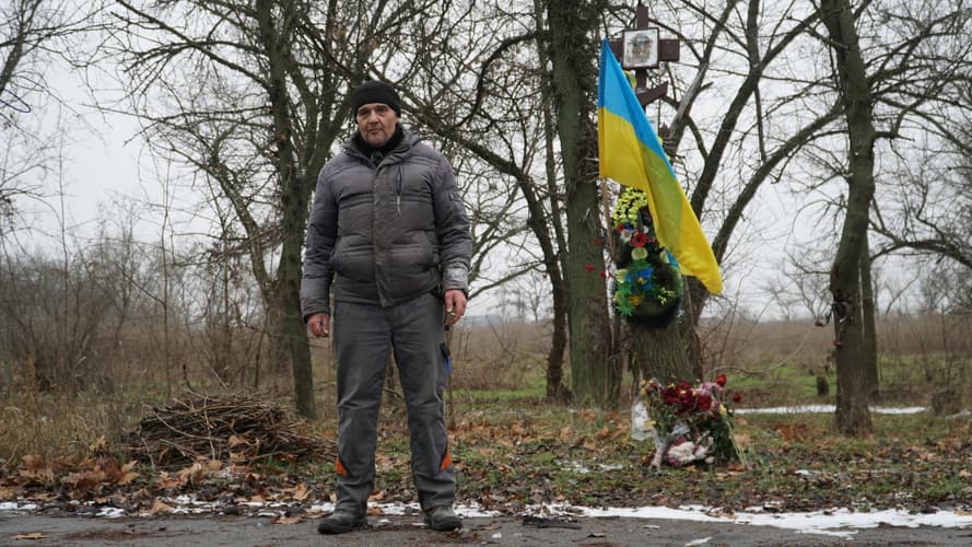 Сергій погоджується з нами поїхати до Бузкового парку. Це пів години від села. Після бою він там не був жодного разу. Дорогою розповідає, як 24 лютого зі словами «бомблять» його розбудила дружина. З села він виїхав 25-го. Планував потрапити на Антонівський міст, бо знав, що там уже йдуть бої. «Хотів їхати на міст, щоб росіяни не пройшли далі — до мого села, дому, родини», — пояснює чоловік.