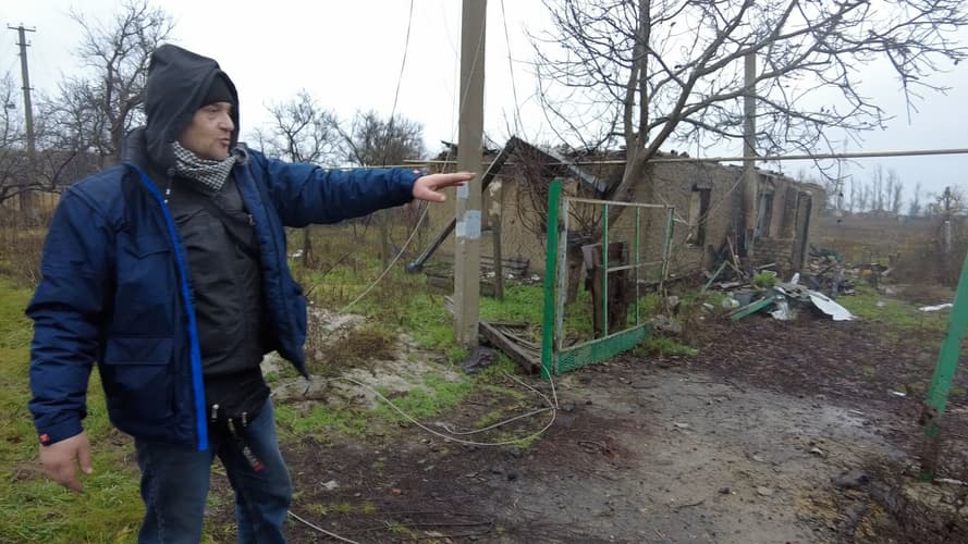 Нині Сергій проживає в сусідському дворі. У тутешньому будинку замість скла на вікнах клейонка, дах із шиферу вцілів, але в стіні — дірка від уламків артилерійських снарядів. Власниця хати Надія — у Польщі.