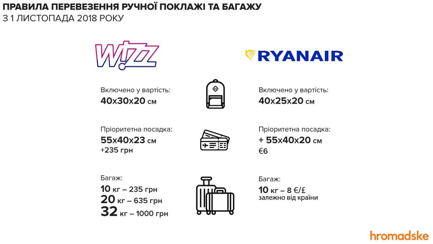 З 1 листопада два провідні європейські лоукостери WizzAir та RyanAir змінюють правила перевезення ручної поклажі та багажу. Тепер жоден з перевізників не забиратиме більші сумки з ручної поклажі безкоштовно до багажу.