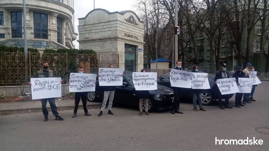 Тим часом під ізолятором тимчасового тримання Служби безпеки зібралися люди з плакатами: «Дудкін — агент ФСБ», «Юра! Чємодан, вокзал, Росія» тощо.