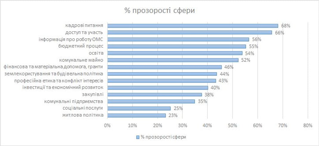 Середній рівень прозорості у різних сферах, досягнутий містами, суттєво відрізняється та коливається в діапазоні від 23% до 68%.