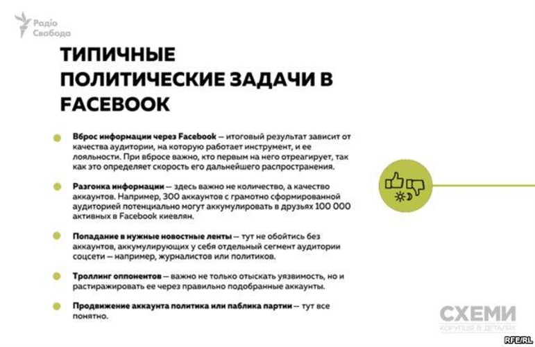 У розпорядженні журналістів опинився документ, який виявився пропозицією від однієї з фірм потенційному політичному клієнту. Серед послуг — «формування інформаційного поля та керування ним в українському сегменті фейсбуку в передвиборчий період». Наприклад, за допомогою «ботоферми» пропонують «вкидати» інформацію, розповсюджувати її та «тролити» опонентів.