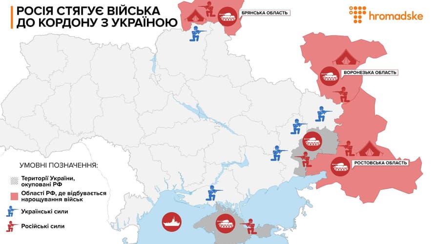 Точні цифри щодо кількості передислокованої техніки та військових визначити вкрай важко, та й вони постійно змінюються. Але як журналісти-розслідувачі, так і західні партнери вказують — це найбільша з 2014 року концентрація російських військ на кордоні з Україною.