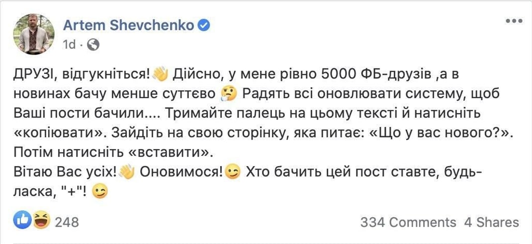 Так, спам Шевченко поширив 22 вересня. У ньому йдеться про те, що для оновлення соцмережі потрібно скопіювати текст з його повідомлення собі на сторінку. А ще закликає ставити «+» у коментарях тих, «хто бачить цей пост».