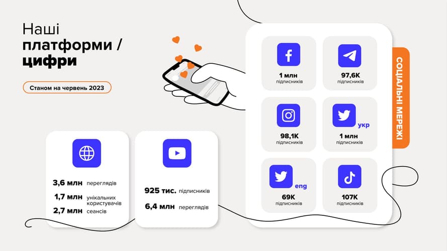 Наприкінці проєкту ми зібрали 4 яскраві історії у матеріалі на сайті. Додатково ми просували історії й з допомогою формату карток для соцмереж. Завдяки комплексному підходу і залученню різних форматів загальне охоплення проєкту з 8 історій на всіх платформа hromadske склало 8 млн.