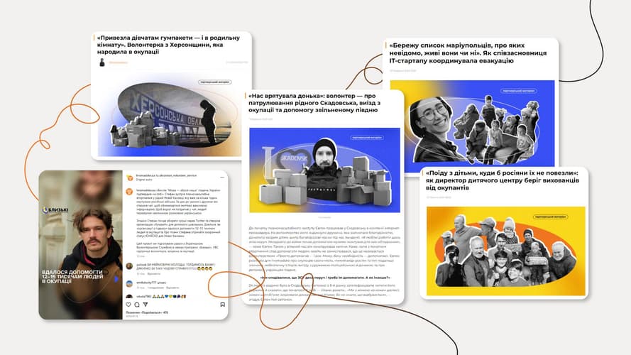 Разом з «Українською Волонтерською Службою» у форматі лонгрідів ми розповіли історії чотирьох волонтерів з окупованих територій. Це прості люди з Херсонської та Київської області, які навіть в умовах окупації не залишилися байдужими до жителів своїх міст та сіл й допомагали продуктами й ліками, часто ризикуючи життям. Історію одного з волонтерів, який виїхав з окупації та знаходиться в Польщі, ми розповіли у відеоформаті. Також усі історії додатково перепакували у картки для соцмереж. Охоплення проєкту сягнуло 2,6 млн.