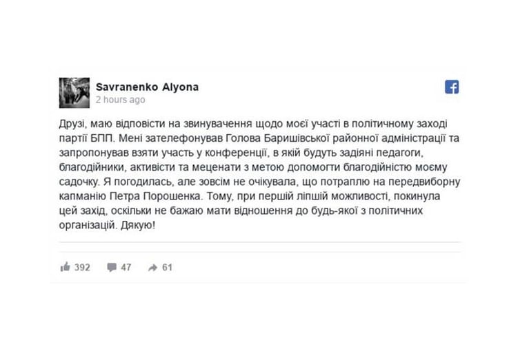 Справа в тому, що до кар’єри реп-співачки Альона Савраненко працювала вихователькою у дитсадочку в Баришівці. У поясненні, яке вона опублікувала у своєму Facebook уже після форуму Порошенка, йдеться, що «їй зателефонував голова Баришівської райдержадміністрації та запропонував взяти участь у конференції, в якій будуть задіяні педагоги, благодійники, активісти та меценати». Мовляв, на цю зустріч Альона «вирушила для того, аби вирішити проблеми свого садочку та не очікувала, що потрапить на передвиборчу кампанію Петра Порошенка».