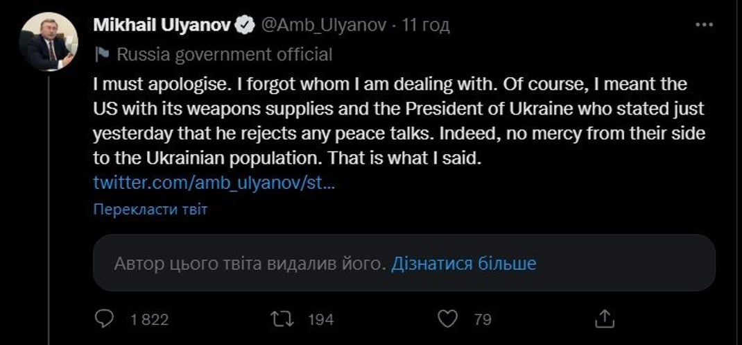 Однак незабаром російський дипломат видалив це повідомлення та почав виправдовуватися. В одному з наступних твітів він написав: «Я мушу перепросити. Я забув, з ким маю справу. Звісно, я мав на увазі США з їхніми поставками озброєння та президента України, який тільки вчора заявив, що відкидає будь-які переговори про мир. Справді, жодної пощади до українського населення з їхнього боку. Ось що я сказав».