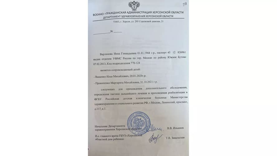 Варламова — це та сама москвичка, яка фігурувала в розслідуванні hromadske про викрадення дітей Херсонщини. З власних джерел ми отримали ексклюзивний документ з довіреністю від місцевої окупаційної влади на Варламову, москвичку 55 років.