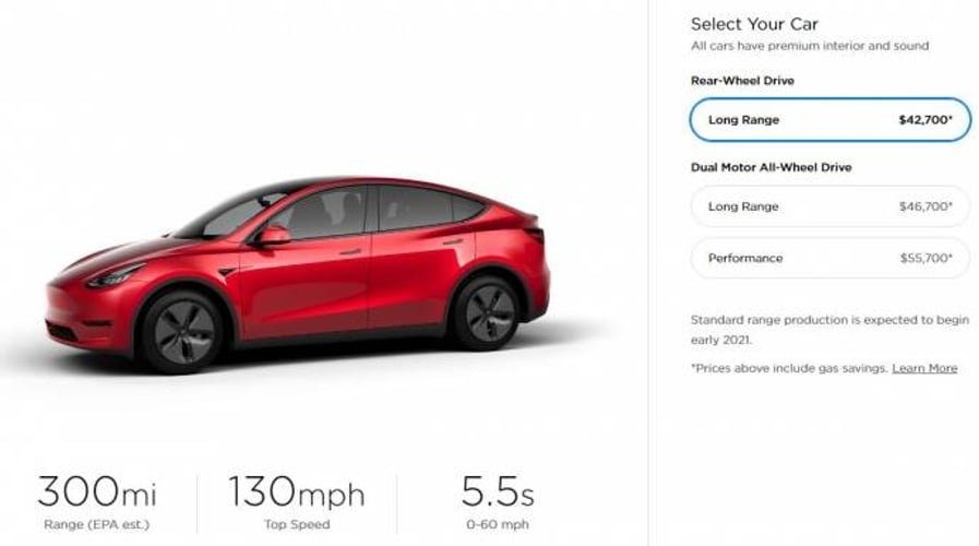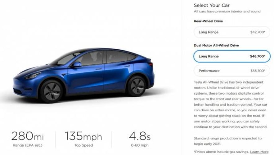Стандартна версія Model Y, здатна проїхати 370 кілометрів за один заряд, буде коштувати 46,7 тисячі доларів ($51 тисяча без вирахування економії бензину) і з’явиться у 2021 році. Таке авто з двомоторним повним може розганятися до 217 миль на годину, час її розгону — 4,8 с. У компанії заявили, що машина з двома моторами може їхати на будь-якому моторі, тому водій може не турбуватися, що застрягне на дорозі.