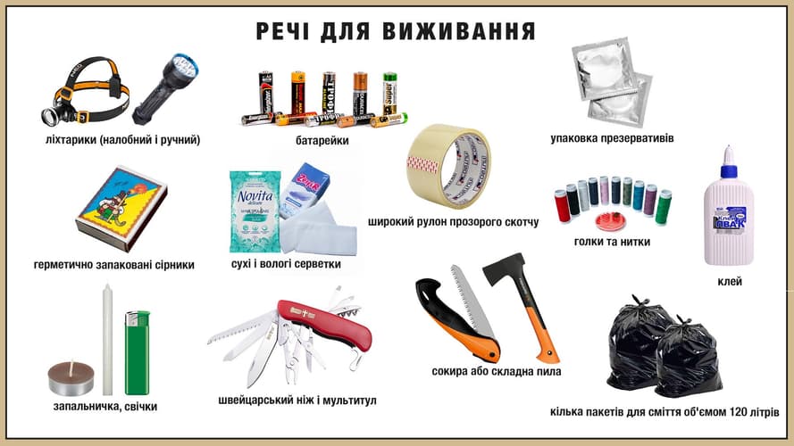 Окрім усього цього, до обовʼязкового набору входять голки та нитки, клей, широкий рулон прозорого скотчу — з його допомогою можна й тента змайструвати, і речі захистити від вологи.