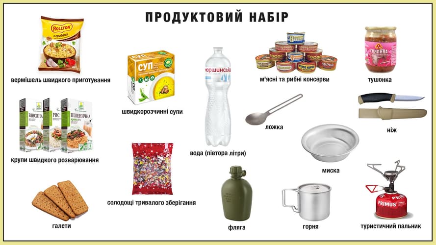 Продуктовий набір обов’язковий — візьміть хоча б півтора літри води на людину та запас їжі на три доби. Це можуть бути швидкорозчинні супи, вермішель швидкого приготування, тушонка, галети, мʼясні чи рибні консерви, низькокалорійні солодощі, льодяники (їхня цінність у тому, що вони висококалорійні, але не тануть і не псуються на сонці). Все це можна спакувати у невеликий казанок місткістю літр-півтора.