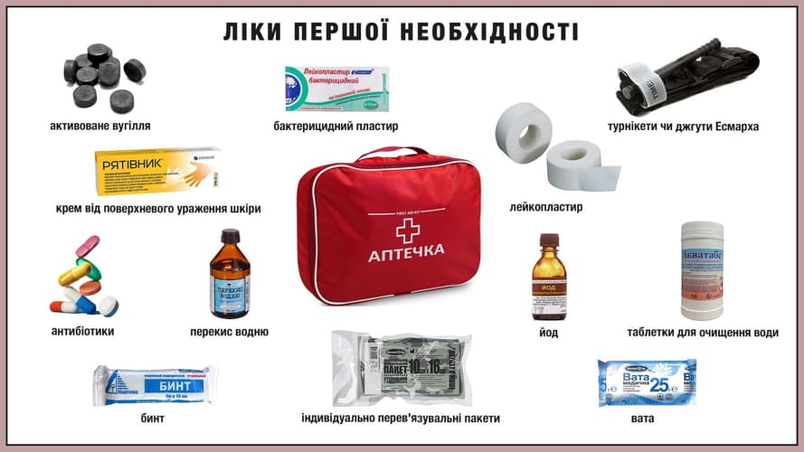 Підготуйте стандартний вміст домашньої аптечки: бактерицидний пластир, крем від поверхневого ураження шкіри, активоване вугілля, засіб від нежитю, антибіотики, перекис водню, етиловий спирт. Окрім цього, варто придбати засоби для надання першої допомоги: бинт, лейкопластир, вата, йод, турнікети чи джгути Есмарха, індивідуальні перевʼязувальні пакети. Також купіть таблетки для очищення води.