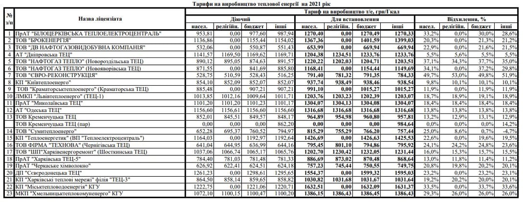 Нацкомісія з тарифів схвалила підвищення у 2021 році тарифів на виробництво теплової енергії для населення, бюджетних та релігійних організацій та інших споживачів для 23 ТЕЦ і когенераційних установок.