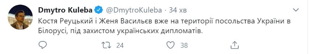 Міністр закордонних справ Дмитро Кулеба повідомив, що Рєуцький та Васильєв уже під захистом українських дипломатів у посольстві України в Білорусі. Проте згодом видалив твіт.