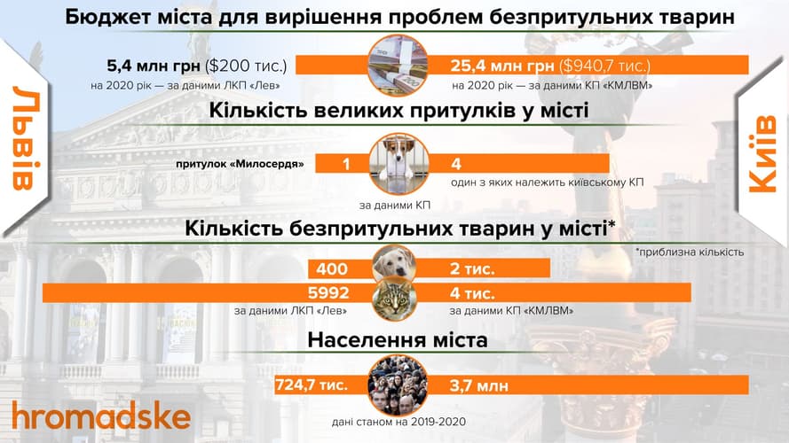 В Україні, за даними міжнародної онлайн-платформи animal-id, на вулицях знаходиться близько 50 тисяч безпритульних тварин. Але підрахунок проводили не у всіх містах України, тому кількість може бути значно вищою. Крім волонтерів і співробітників притулків, безпритульними тваринами в містах займаються комунальні підприємства, які проводять їх відлов, вакцинацію, стерилізацію і лікування. Як працюють такі підприємства у Києві та Львові, хто ще допомагає бездомним тваринам і як зменшити їх число на вулицях — дізнавалося hromadske.