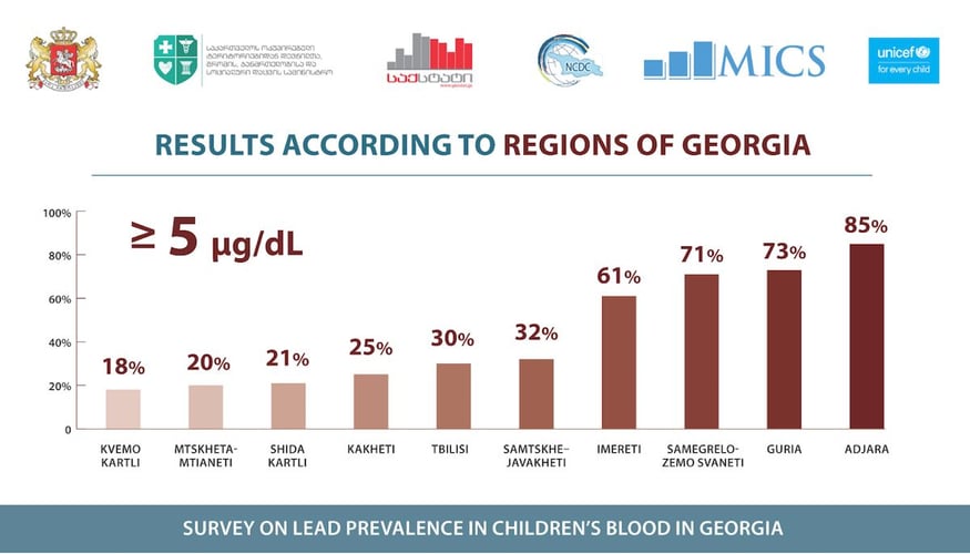 Ці показники різняться в залежності від регіону країни, зокрема найгірші в Аджарі, де вище норми вміст свинцю у 85% дітей, а найкращі — в Квемо Картлі (18%).